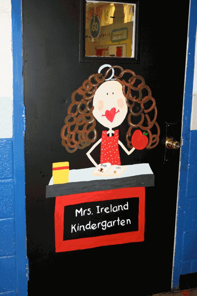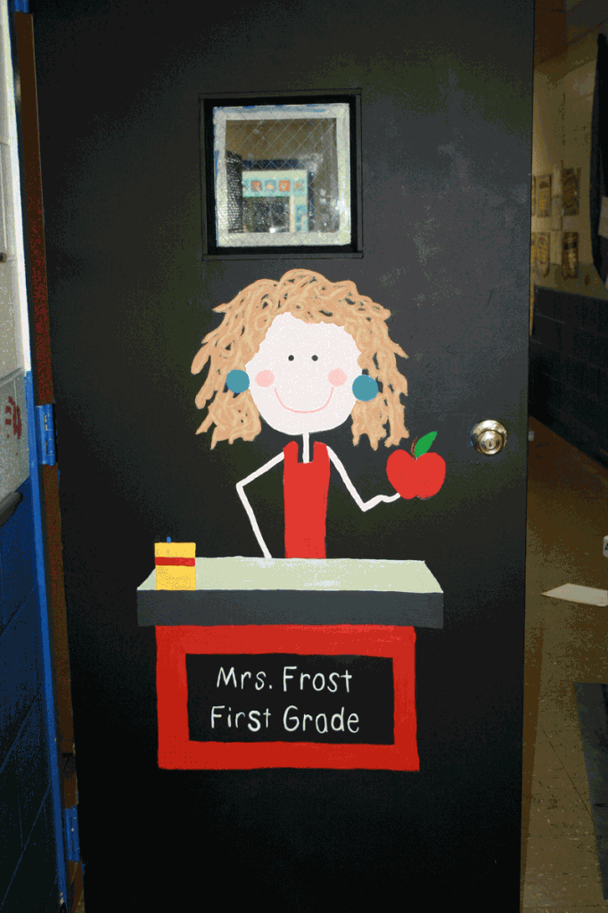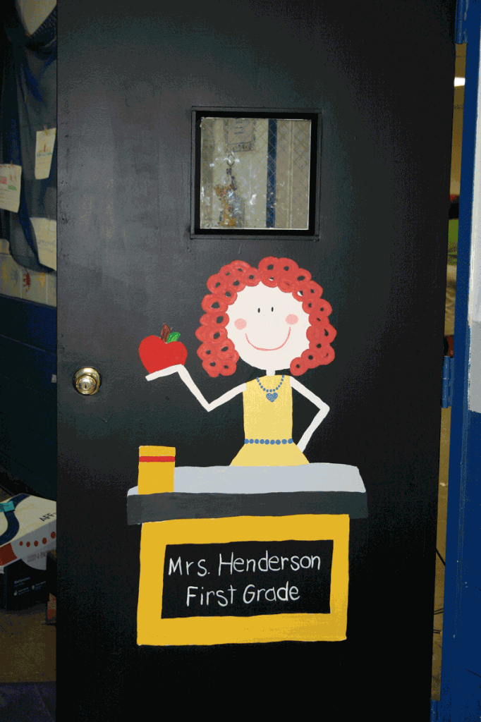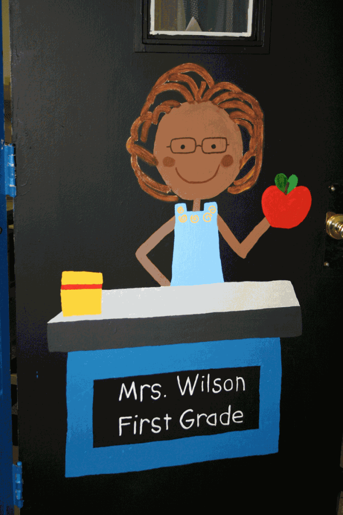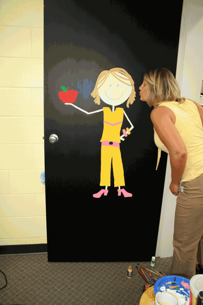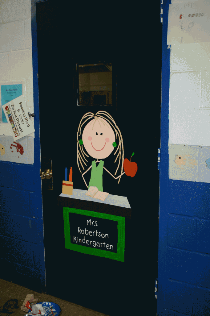 My sister was a kindergarten teacher at Constantine Elementary School in Anniston, Alabama. She came up with a great idea to help the kids identify their rooms at the beginning of the year. We painted the teacher’s doors with chalkboard paint and then painted a stick figure representation of each teacher along with their name and grade on their door. This was a blast.